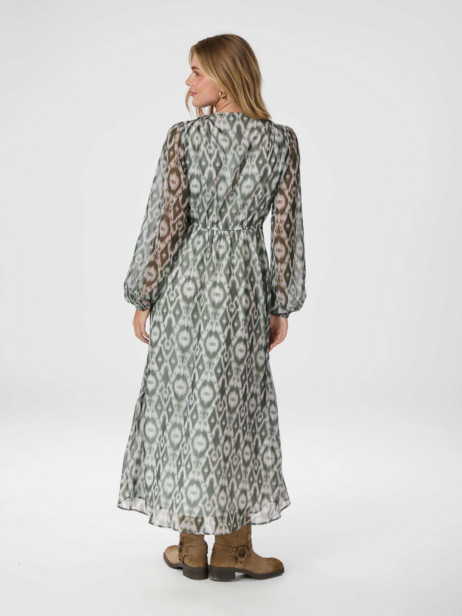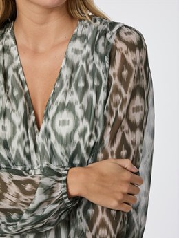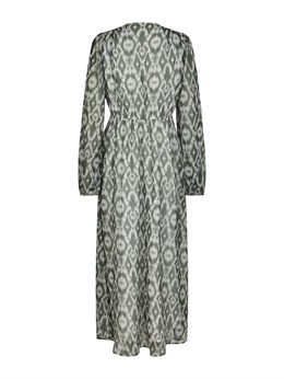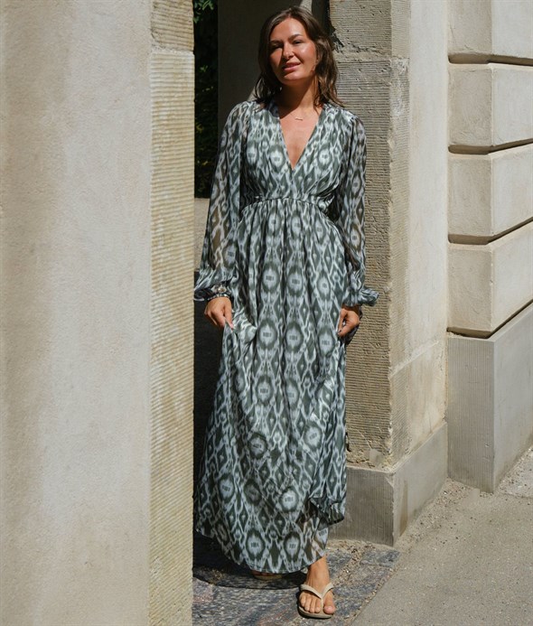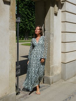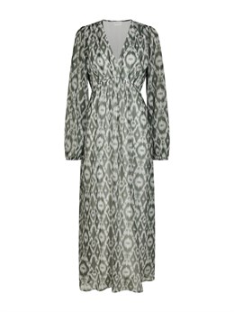Smuk lang kjole fra Neo Noir med et dejligt grafisk print i støvet grøn. Kjolen har en afslappet, men feminin pasform. Ærmerne er lange og afsluttet med elastik. Modellen er 176 cm og bærer en størrelse 36.