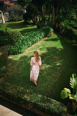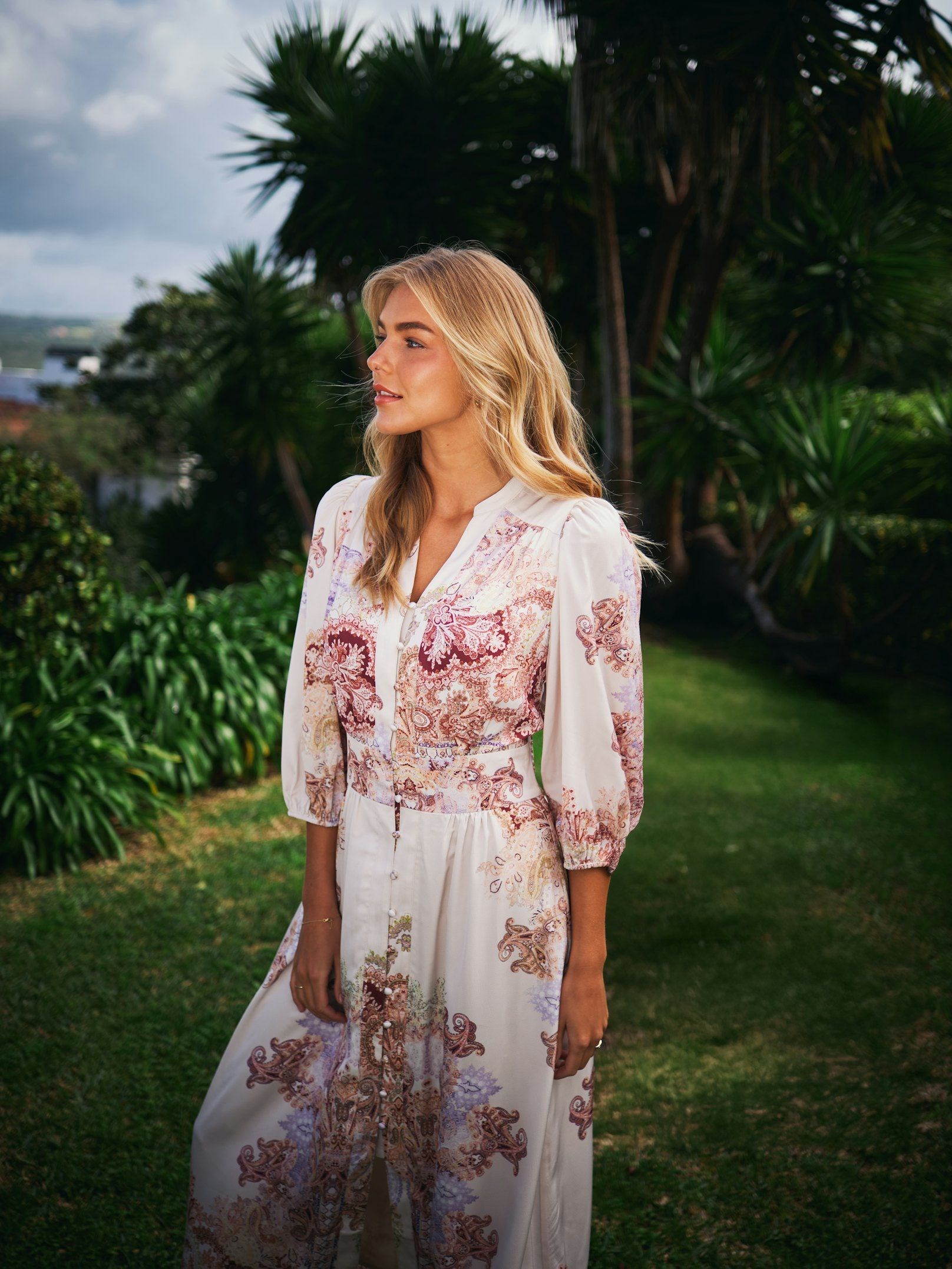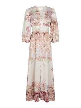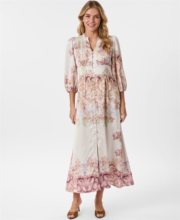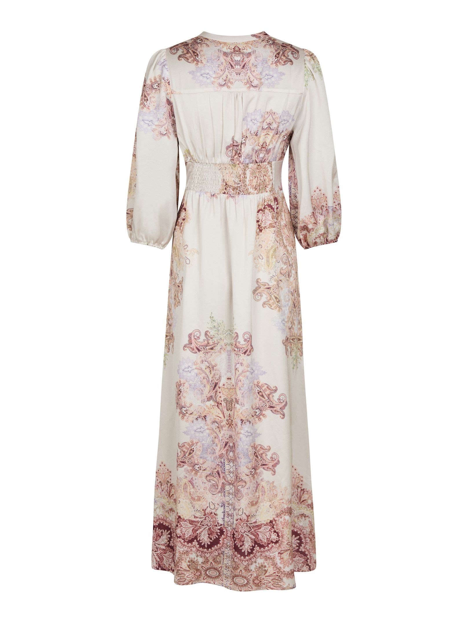Smuk lang kjole fra Neo Noir med feminint paisley print i rosa nuancer. Kjolen har en flot facon med smock i ryggen og en fin v-udskæring ved halsen med knappelukning ned fra. Ærmerne er trekvartlange med elastisk kant. Modellen er 176 cm og bærer en størrelse 36.