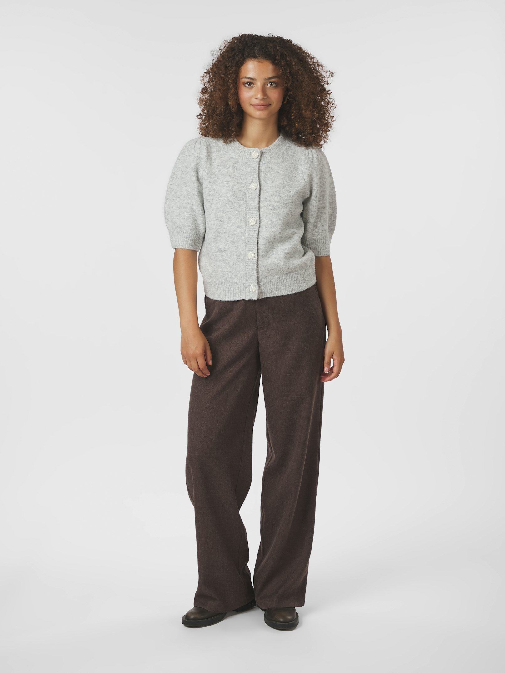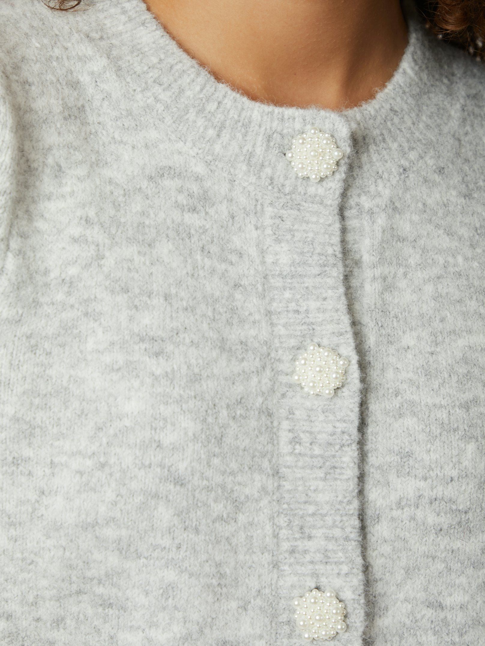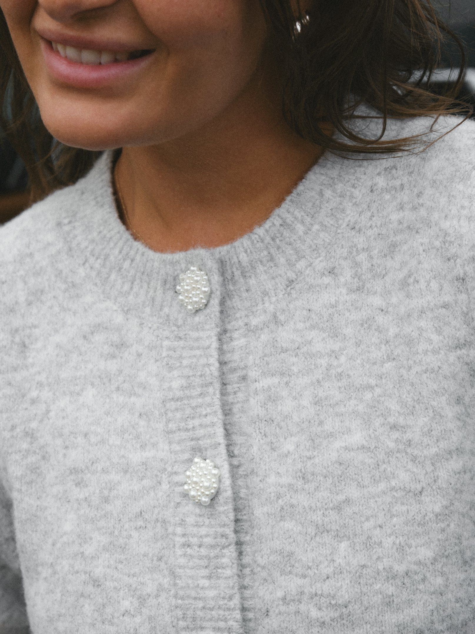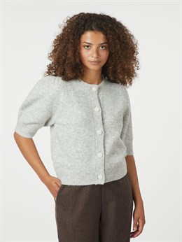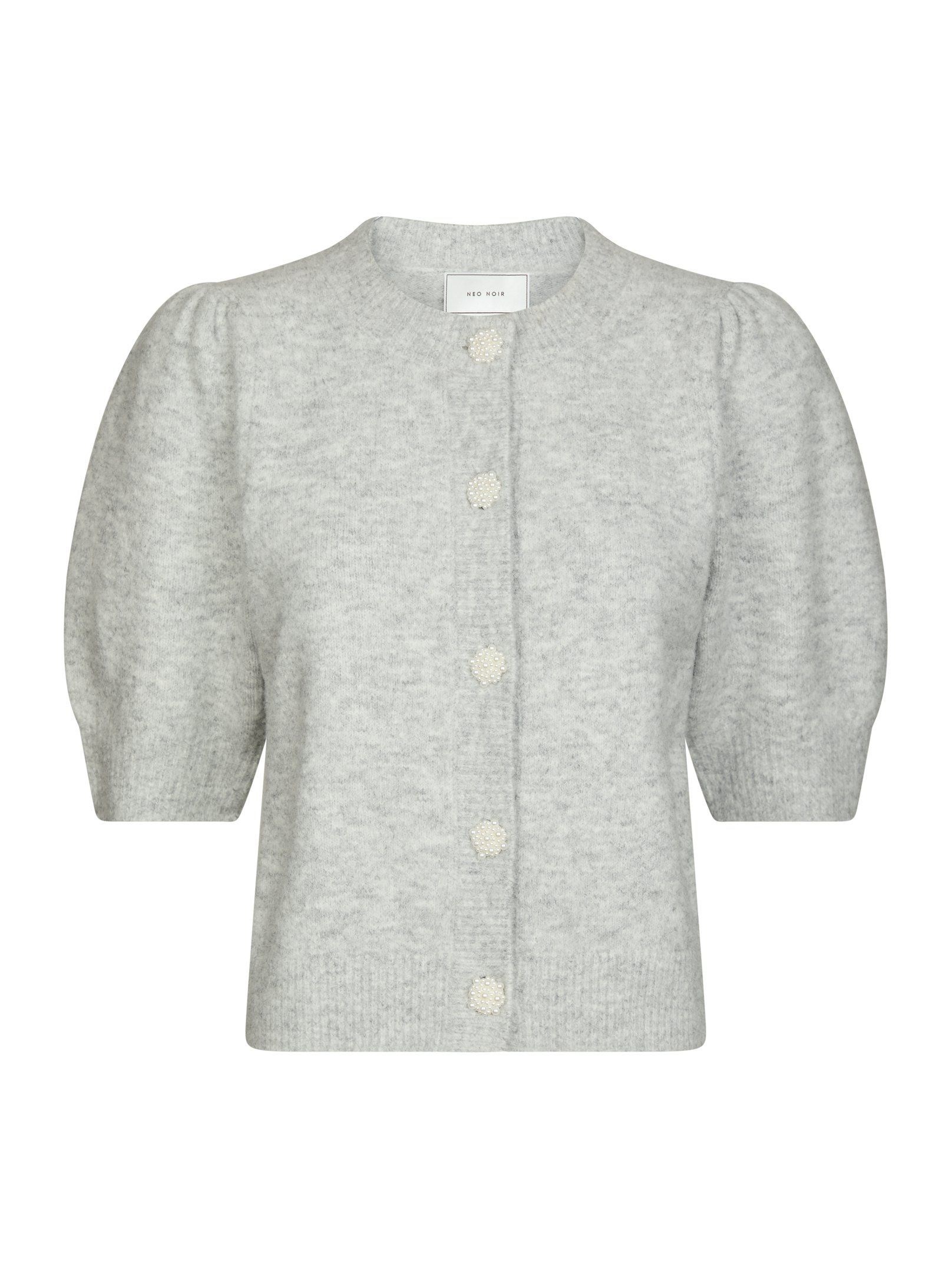 Sød strikket cardigan fra Neo Noir med korte ærmer og virkelig fine dekorative perleknapper. Den har en rigtig skøn pasform og en dejlig lun kvalitet. Modellen er 176 høj og iført størrelse 36.