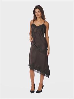 Smuk asymetrisk strop-top fra Neo Noir i mørkebrun satinkvalitet med dekorativ blonde. Modellen er 176 cm høj og bruger størrelse 36.