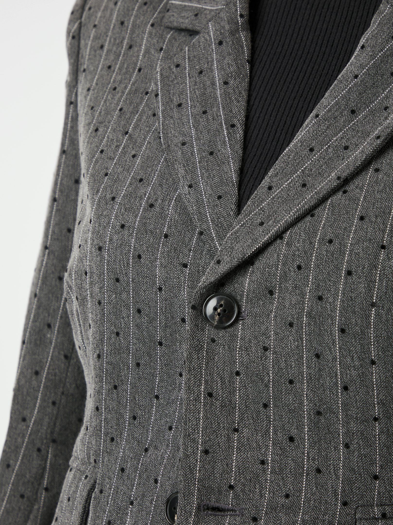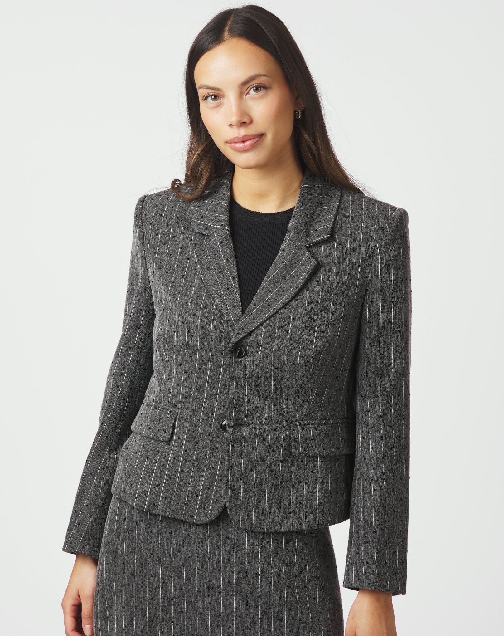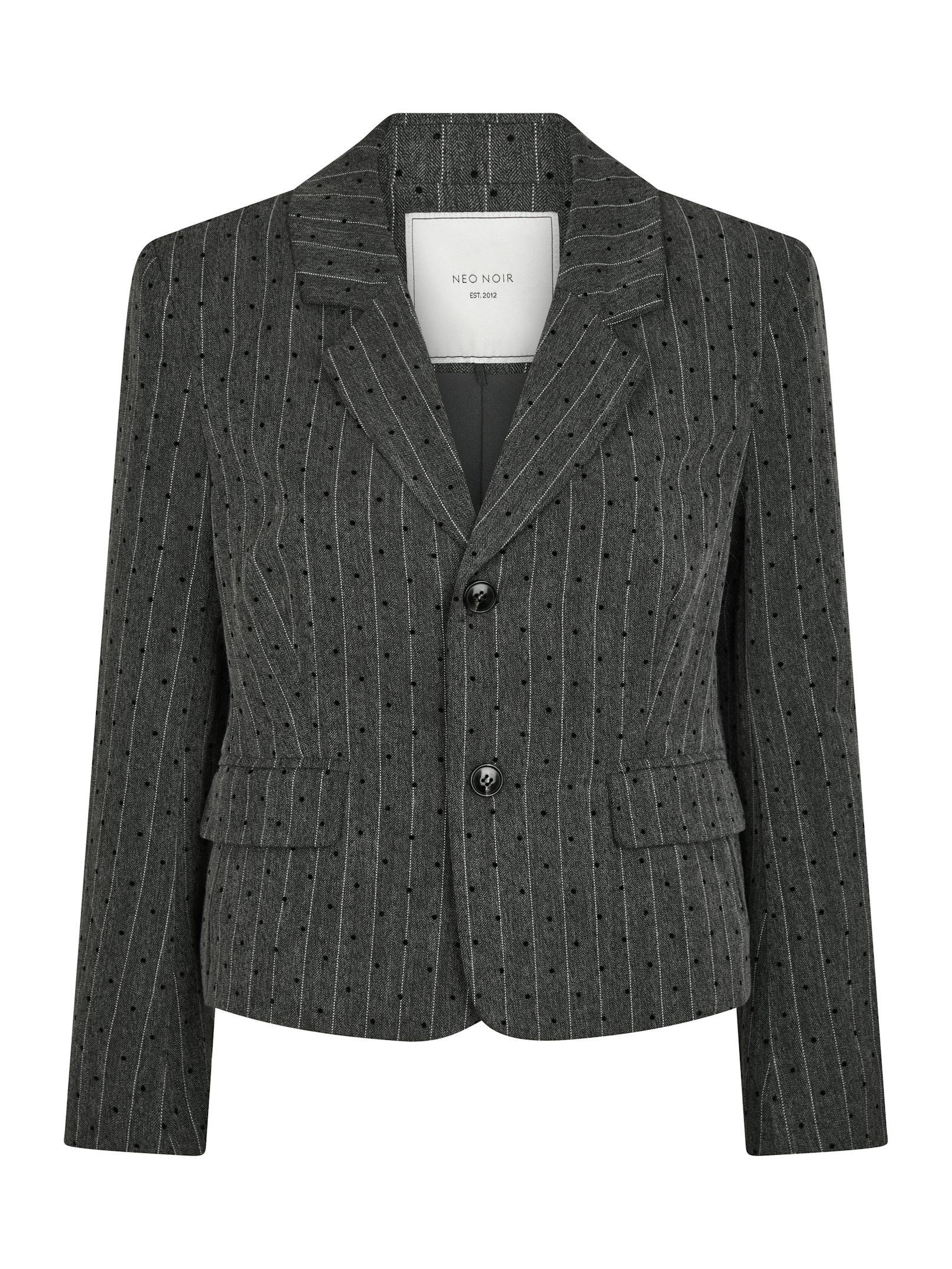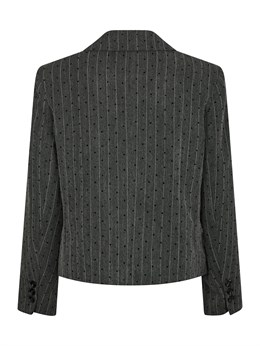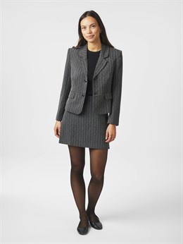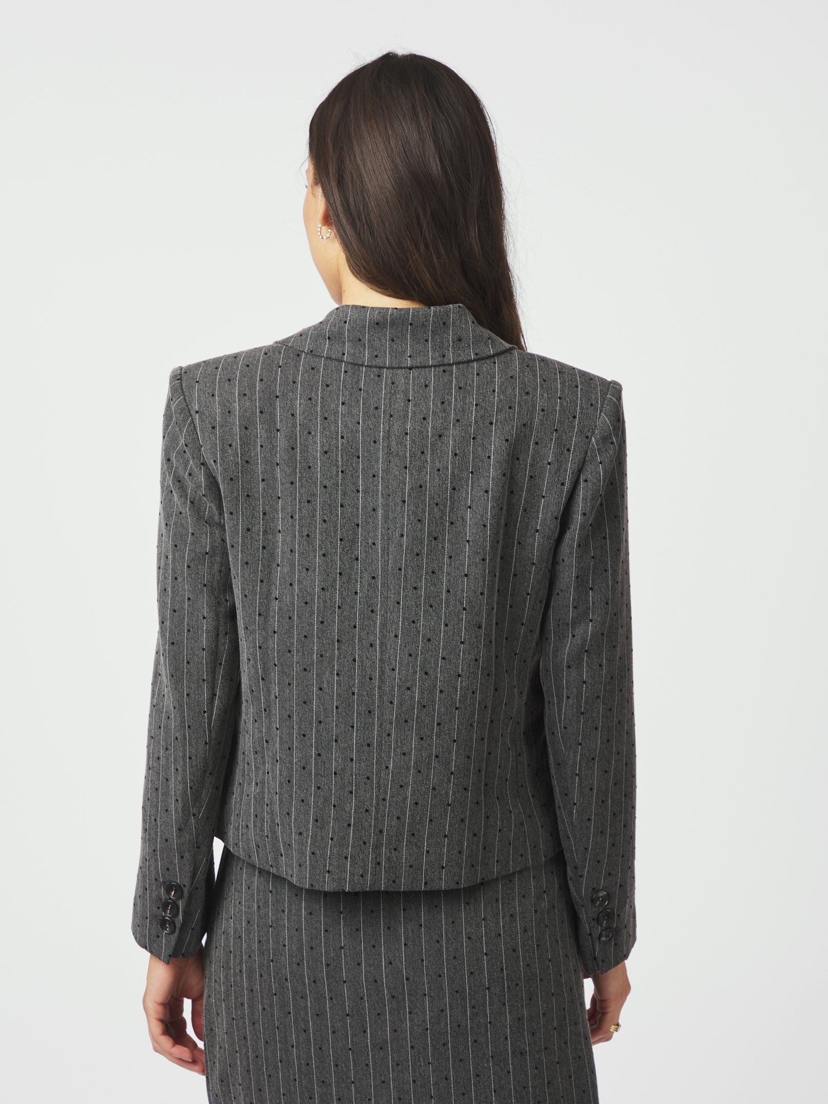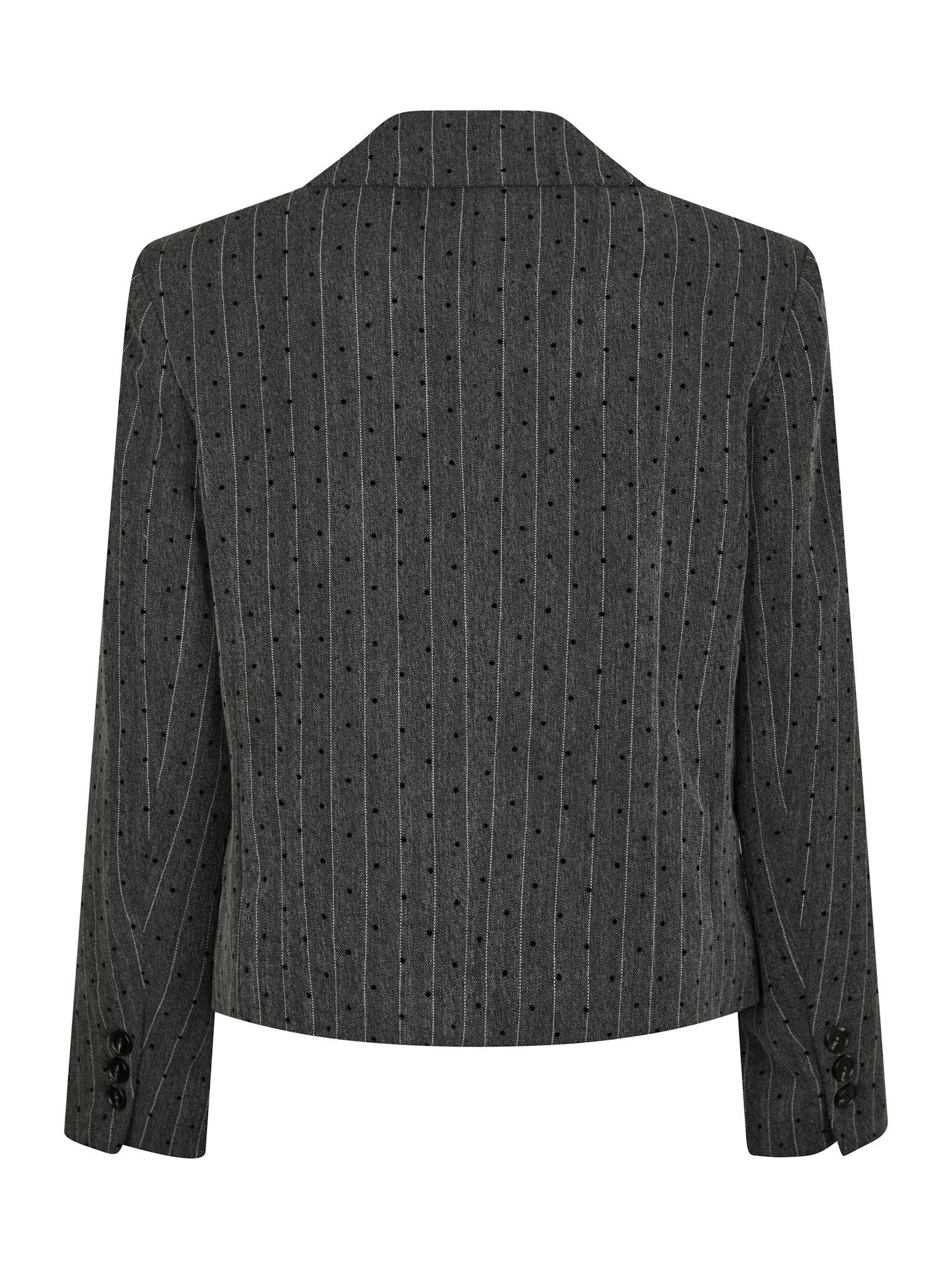 Kort mini blazer med en tætsiddende pasform. Blazeren kommer i en stribet kvalitet med små sorte prikker. Modellen er 176 cm og bærer en størrelse 36.