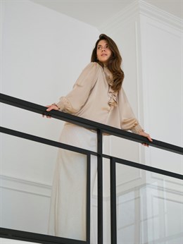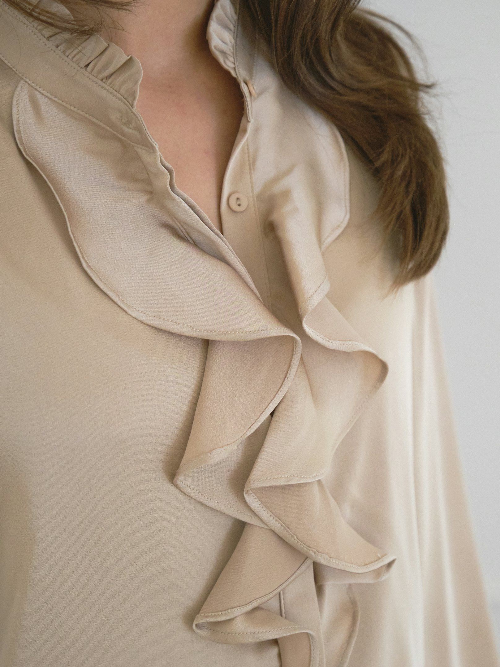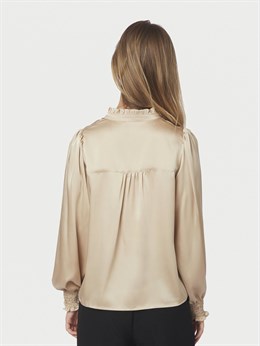 Smuk skjortebluse fra Neo Noir i blød sandfarvet satin med knappelukning og flæsedetaljer. Ærmerne er lange og med smock omkring håndleddet. Modellen på billedet er 176 cm og iført størrelse 36.