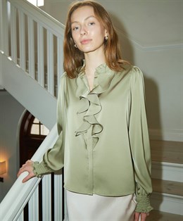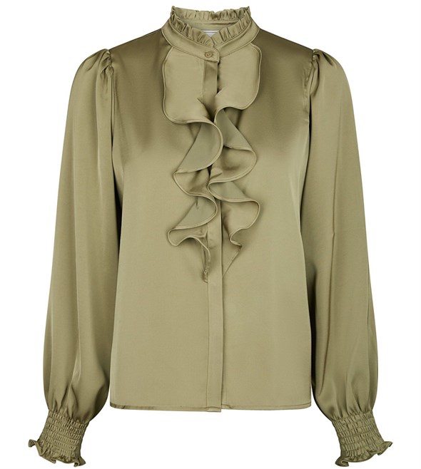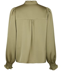 Smuk skjortebluse fra Neo Noir i blød grøn satin med knappelukning og flæsedetaljer. Ærmerne er lange og med smock omkring håndleddet. Modellen på billedet er 176 cm og iført størrelse 36.